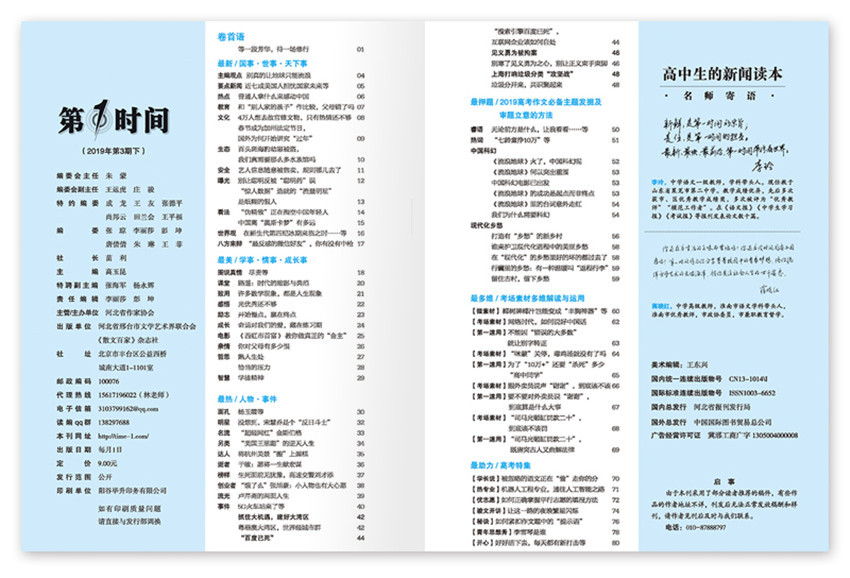 按照实用、新颖、个性、快速的宗旨,向高中学生传递新的作文素材信息,为广大高中学生丰富知识,拓展视野搭建平台。《及时时间》专为高中生量身打造的新闻类读本!及时时间•天下事·万象记:天下万象在此一览无余;情事·同学:你的心事于此可得释放;及时时间•成长事•致青春:微青春的那一抹青涩点赞,帮助高中生开阔视野,从中学会观照自我,得到教益,并且能够锤炼恰当的处世态度,打造应有的宏观格局。