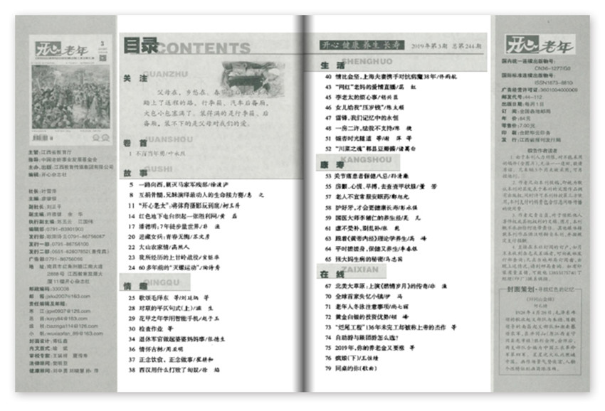 《开心·老年》杂志创办于2007年,注重理论联系实际,创刊多年来得到了长足发展,杂志内容充实、版式清新,装帧精美,深受广大读者好评。以开心、健康、着重、长寿为主导,以服务、实用为特点,设有故事、情趣、生活、康寿等板块和众多栏目,老年人的养生之道。