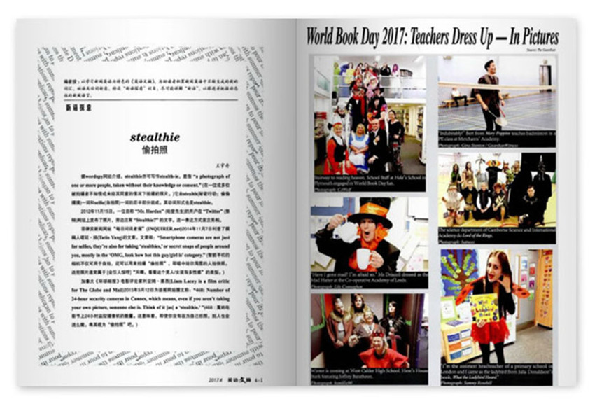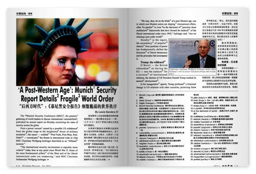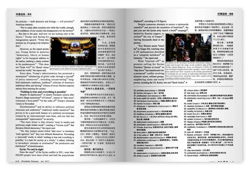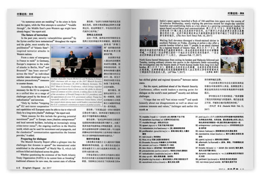 《英语文摘》用四句话表述自己的特点:摘译外电报刊精华,了解全球风云变幻,突破新闻英语难关,获取多方有益资讯。