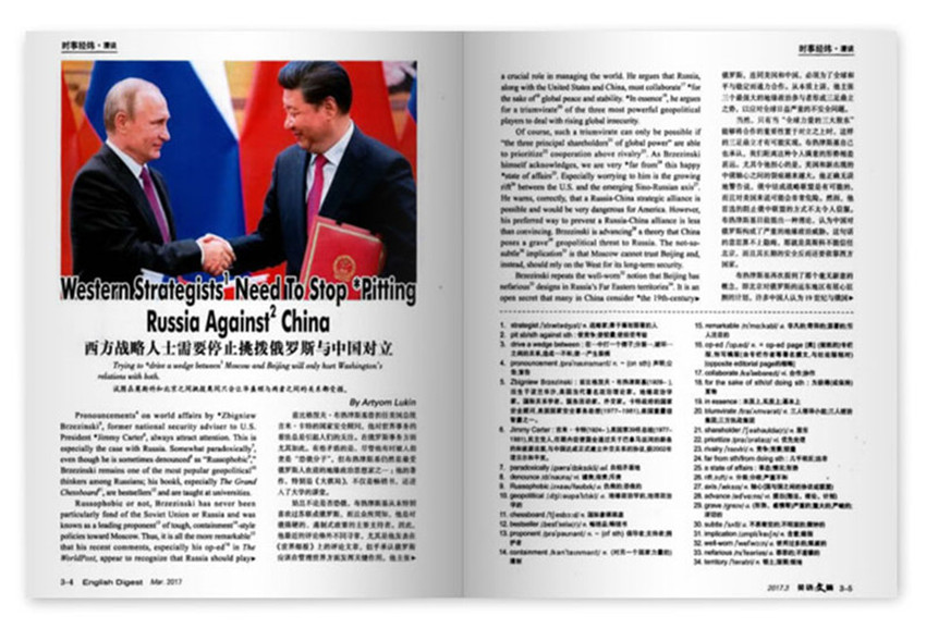 《英语文摘》杂志,(月刊),是面向全国发行的外语类期刊,杂志拥有独到的思维与敏锐的眼光,使得杂志成为众多国际大品牌客户重视的核心媒体之一。用四句话表述自己的特点:摘译外电报刊精华,了解全球风云变幻,突破新闻英语难关,获取多方有益资讯。