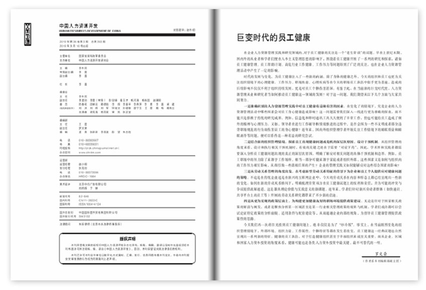《中国人力资源开发》杂志,(月刊),是面向全国发行的职场培训类期刊,杂志拥有独到的思维与敏锐的眼光,使得杂志成为众多国际大品牌客户重视的核心媒体之一。主要设有专题研究、组织行为、人力资源、案例研究、开发技术、政策研究、劳动关系、理论前沿、实践创新、职业发展等机动栏目。